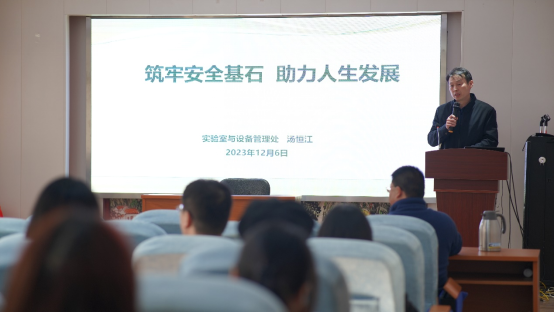首先,汤恒江副处长为大家带来了题为《筑牢安全基石,助力人生发展》的讲座。他从实践出发,结合实际案例详细介绍了实验室的安全管理规范、实验室中常见的安全隐患及预防措施,着重强调了实验室安全教育的重要性。他指出实验室是科研的重要场所,也是安全隐患较多的地方,希望每位师生都能加强实验室安全意识,自觉遵守实验室规章制度,确保实验室安全。