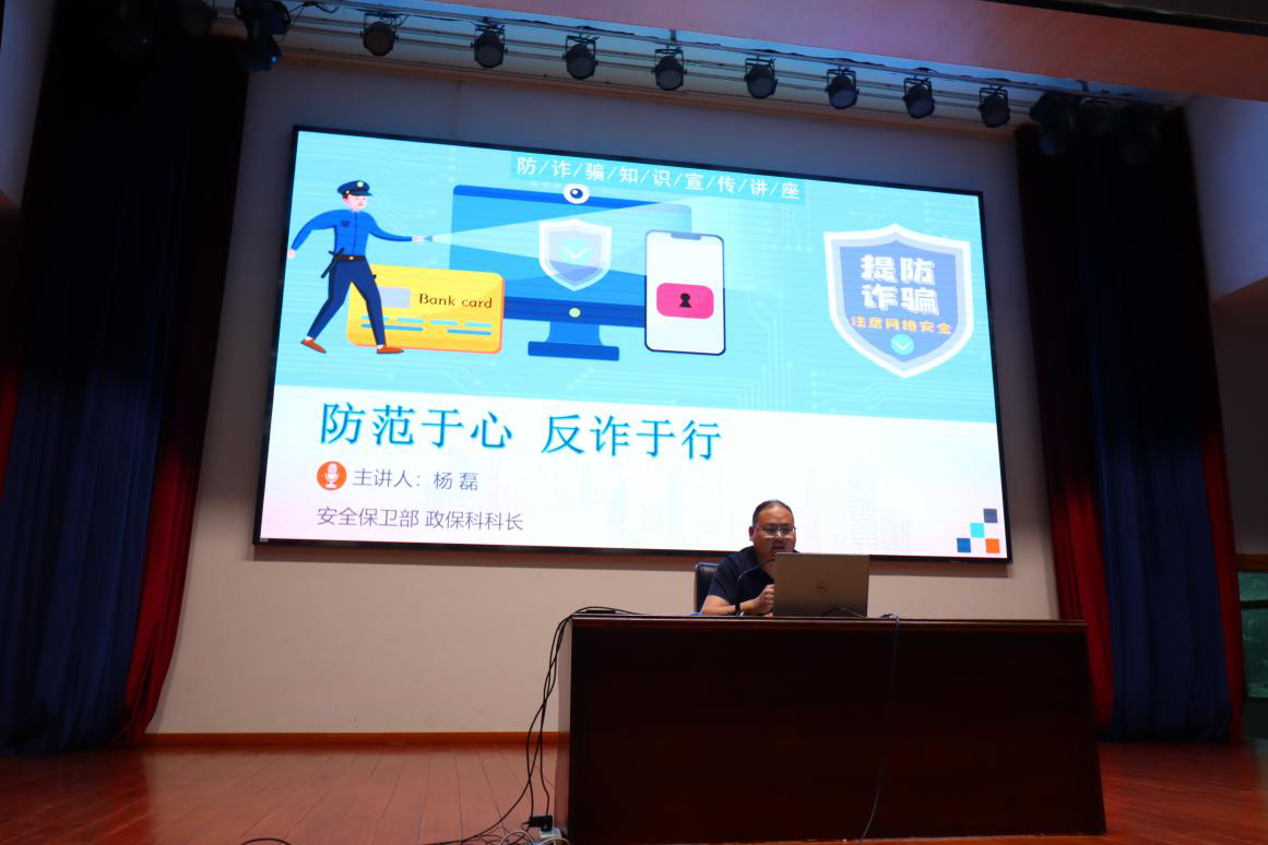 为深入学习贯彻习近平新时代中国特色社会主义思想和党的二十大精神,贯彻落实上级部门及学校关于安全工作的相关要求,教育引导员工牢固树立安全意识、提高安全防范能力,筑牢校园安全防线,2024年5月9日晚,皇冠集团网站邀请我校安全保卫部政保科科长杨磊老师为皇冠集团网站硕博研究生、本科生作一场题为“防范于心 反诈于行”的安全教育系列讲座,本次讲座皇冠集团网站全体员工参加。
