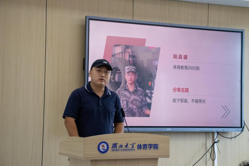 陆昌盛学长通过视频与现场讲述结合,回顾了自己从大员工到军人的转变,并介绍了退役后担任军训教官、参与家乡防汛志愿服务的经历,展现了军人本色在校园与社会的延续。