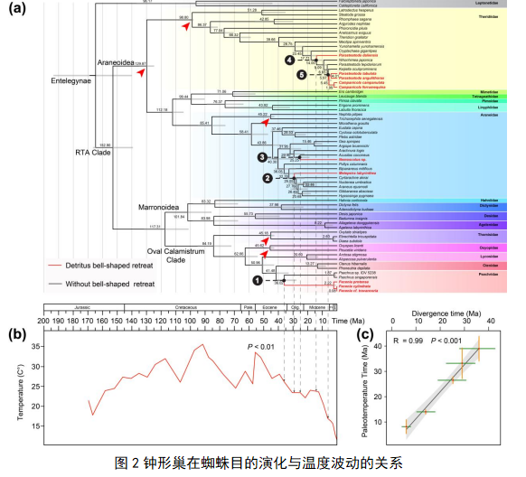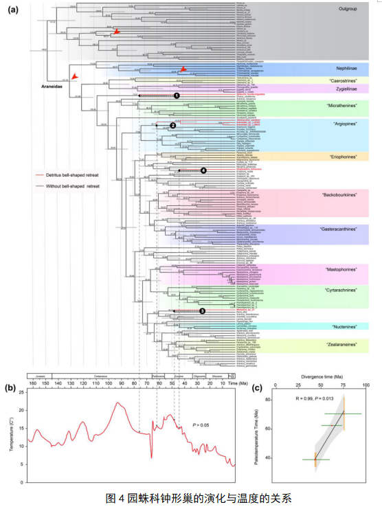 (a)园蛛科BEAST树。红色箭头表示化石校正节点,钟巢蛛种名标记为红色;(b)钟形巢分化时间与温度的卡方检验;(c)钟形巢的分化时间(绿色水平线段代表95%后验率)与全球变冷事件(橙色垂直线段代表全球冷却事件的起止时间)之间的线性回归和斯皮尔曼相关性。