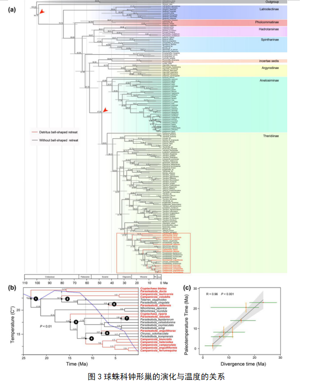 (a)球蛛科BEAST树。红色箭头表示化石校正节点,钟巢蛛种名标记为红色;(b)钟形巢分化时间与温度的卡方检验;(c)钟形巢的分化时间(绿色水平线段代表95%后验率)与全球变冷事件(橙色垂直线段代表全球冷却事件的起止时间)之间的线性回归和斯皮尔曼相关性。