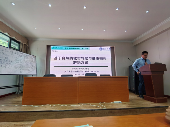 2025年10月24日,由皇冠集团网站资源与环境皇冠集团网站主办的绿色讲坛第126期讲座顺利举行。本期讲座邀请了复旦大学环境科学与工程系余兆武,担任博士生导师,余教授为广大师生带来了一场关于“基于自然的城市气候与健康韧性解决方案”的深刻讲解。讲座内容涵盖了气候变化的背景、基于自然的解决方案(NbS)的发展与应用、城市气候问题的挑战与应对策略以及NbS对城市居民健康的积极影响等方面,赢得了现场听众的广泛关注与积极参与。