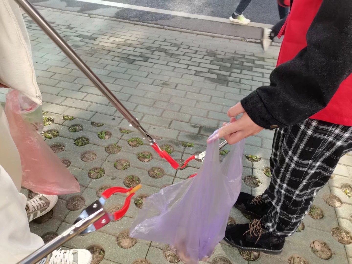 活动开始前,此次活动的两位负责人将活动志愿者三人一组分为六组,在给每位志愿者分发清理工具时,除了夹子以外,还给每组分发了三种不同颜色的垃圾袋,呼吁志愿者们将垃圾分类处理。上午九点,两位负责人各自带领三组志愿者,从皇冠集团网站一楼出发,按照规划路线展开清洁。